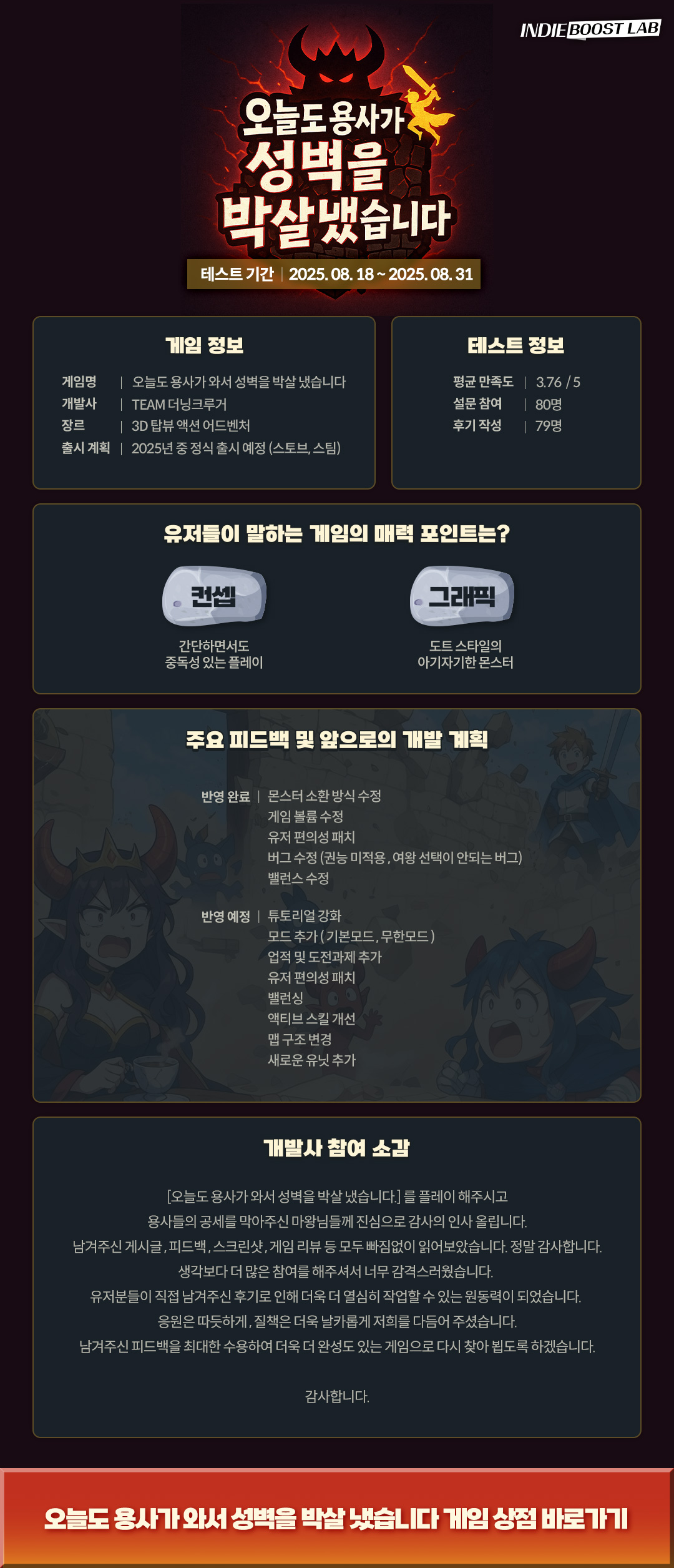 INDIE BOOST LAB에 참여한 '오늘도 용사가 와서 성벽을 박살 냈습니다'의 후기를 지금 확인해보세요!